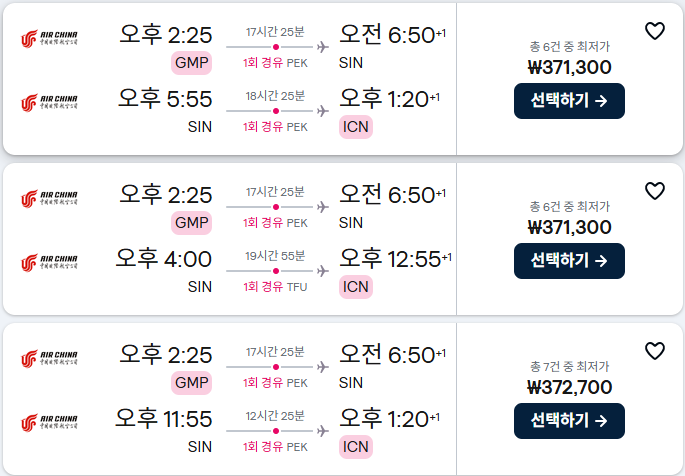 싱가포르 항공권 26년 1월 2월 부산 인천 출발 기준 직항 경유 가격 비교