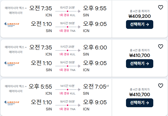 2. 인천 출발 싱가포르 항공권 노선 & 가격