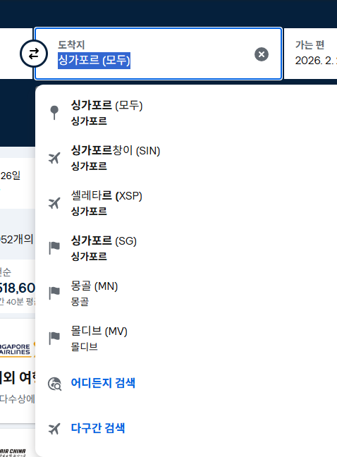 " 싱가포르 항공권 26년 1월 2월 요금비교 "