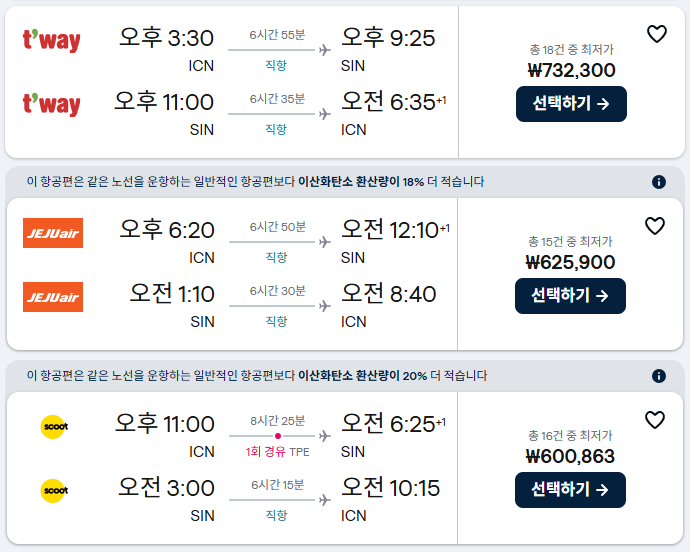 2. 인천 출발 싱가포르 항공권 노선 & 가격