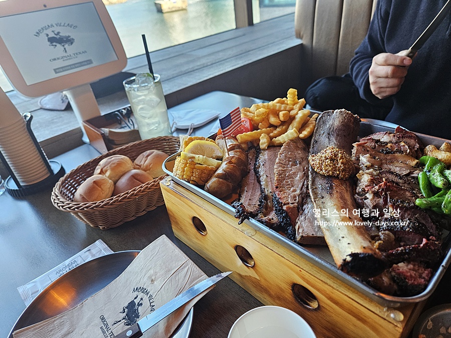비프립, 브리스킷, 수제소세지, 시즌야채, 감자튀김, 코울슬로가 세트로 나온다.