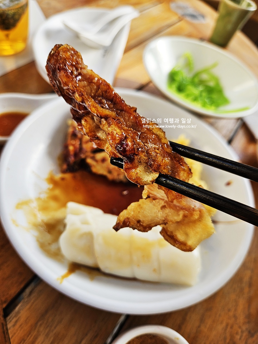 기름진 음식 먹을 때 김치 역할을 해준다. 공심채나 줄기상추 같은 채소 요리인데, 식감이 오독오독하고 소스가 상큼해서 입안을 개운하게 정리해 준다. 참기름이 들어간 것인지 고소한 맛도 좋다.