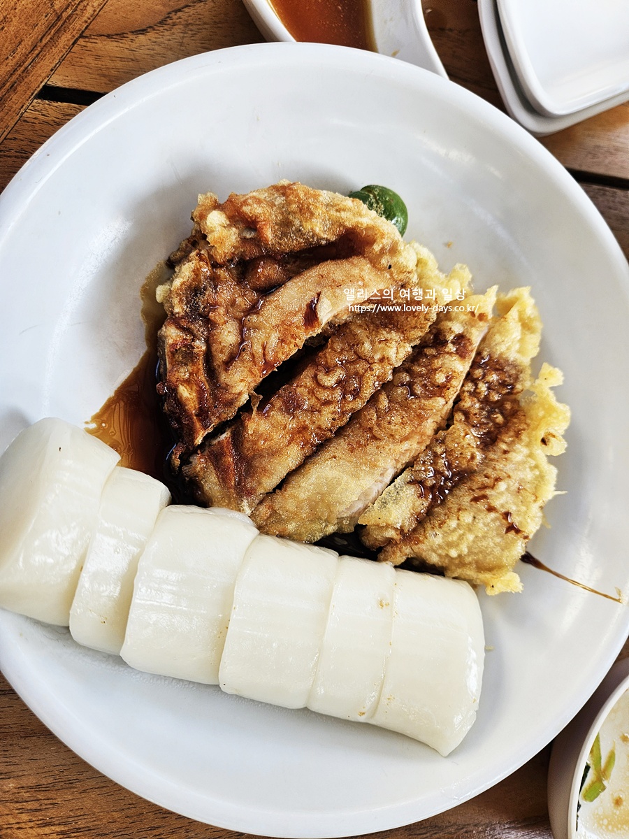 엄청 쫀득한 가래떡인데 그 크기도 상당히 굵다. 돈까스와 가래떡을 같이 먹는 것이 좀 특이하긴 했지만 또 어울리지 않는 것은 아니었다.