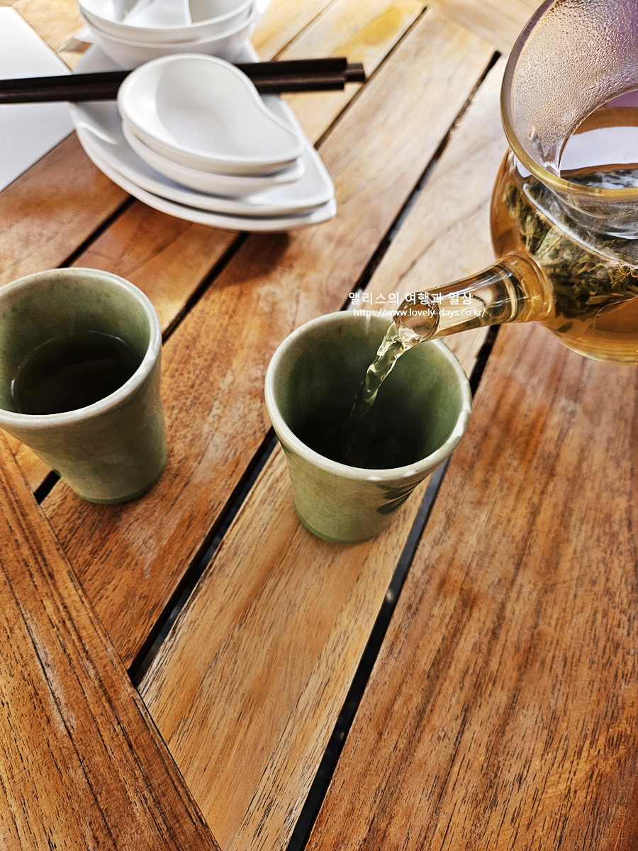 판롱티앤디 특유의 여유로운 풍경을 보며 식사할 수 있다. 테이블 간격도 넓어서 옆 사람 대화 소리에 방해받지 않고 오롯이 햇살과 음식을 즐길 수 있었다. 기본으로 제공되는 차 한 잔 마시면서 경치만 봐도 힐링이 된다.
