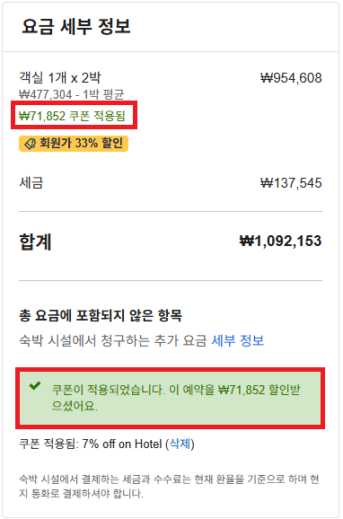 보다시피 무조건 최종 결제금액에서 할인이 중복으로 적용된다는 것을 확인할 수 있다. 위 결제내역은 다낭의 반얀트리 리조트 2박인데, 보다시피 최원가로 33% 할인된 가격에서 추가로 7% 더 할인된 것을 알 수 있다.