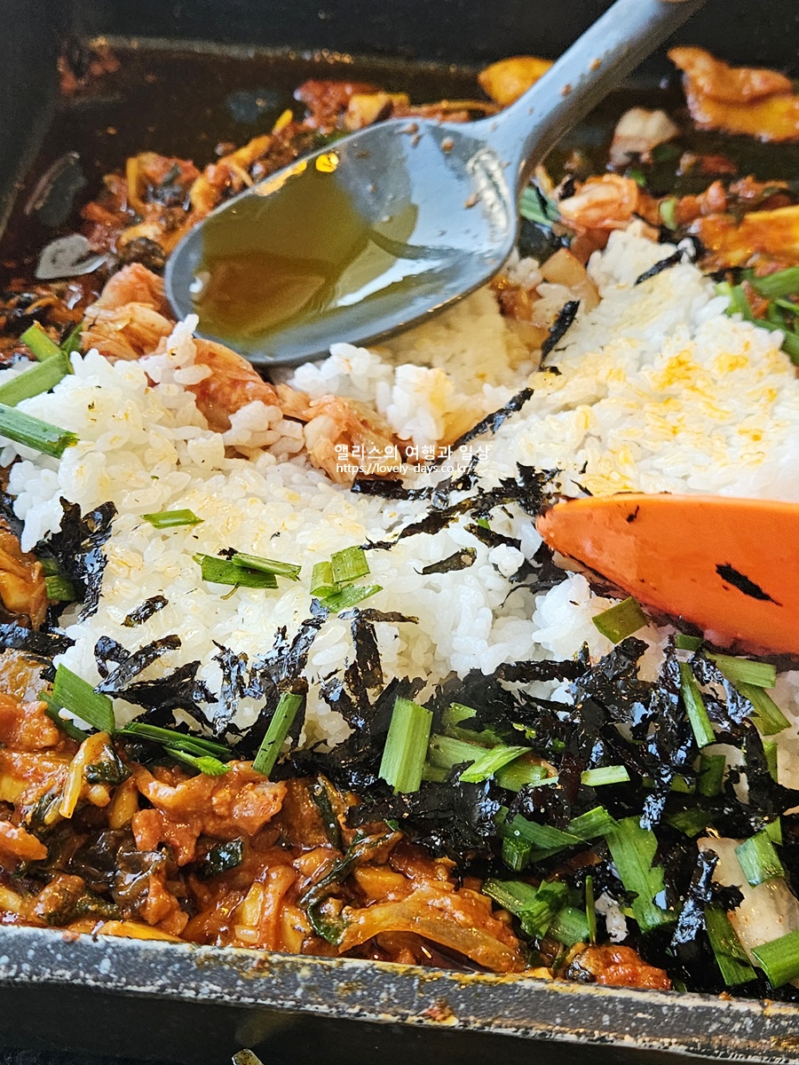 잘 구워진 다음에 반찬으로 나온 콩나물 무침도 같이 넣어서 먹어주니 아삭한 식감까지 더해줘서 좋았다.