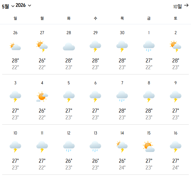 우리나라의 한여름 날씨와 비슷하거나 조금 더 덥게 느껴질 수 있다.