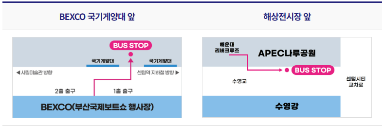 BEXCO에서 해상전시장까지 도보이동은 10분 내외 소요되며 탑승 장소는 교통 상황 등 사정에 의해 변경될 수 있다.