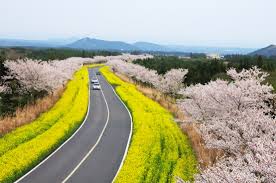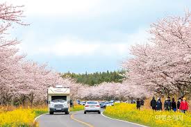 약 10km에 달하는 구불구불한 2차선 도로 양옆으로 아래에는 샛노란 유채꽃이, 위로는 팝콘처럼 팡팡 터진 연분홍 벚꽃 터널이 끝없이 펼쳐진다.