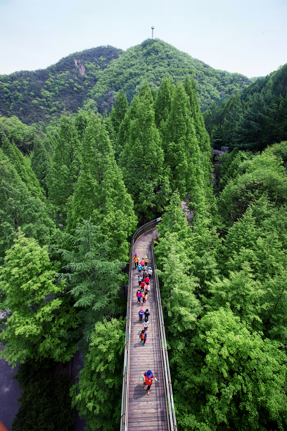 하늘 높이 뻗은 메타세쿼이아 나무 사이로 놓인 스카이웨이(숲속 어드벤처)를 걷다 보면 마치 숲의 바다 위를 걷는 듯한 짜릿함을 느낄 수 있다.