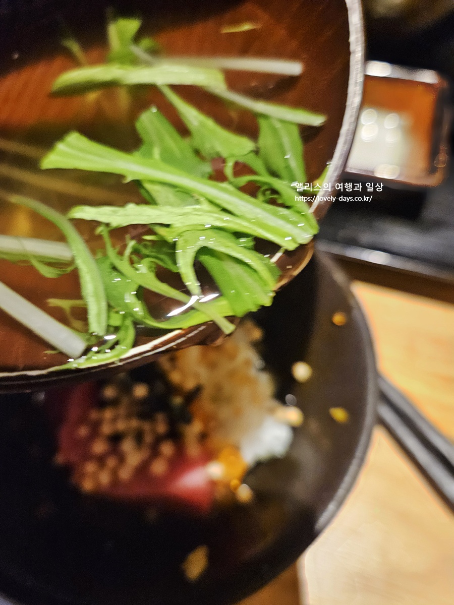 참고로 나는 평소에도 오차즈케를 즐기는 편이어서 마지막 남은 회와 밥은 따뜻한 백탕을 부어서 샤브샤브와 같은 느낌을 더해서 오차즈케로 먹었다.