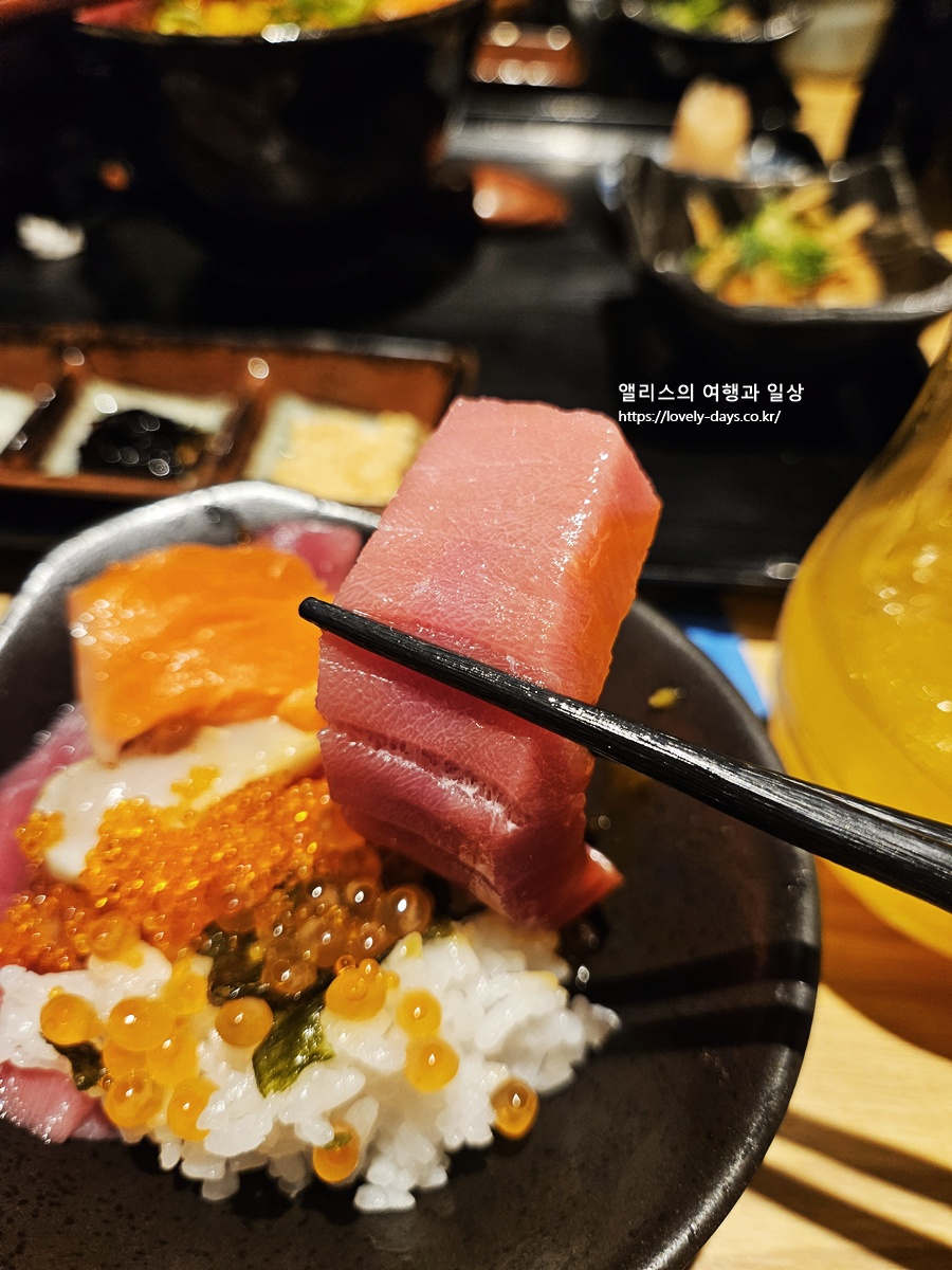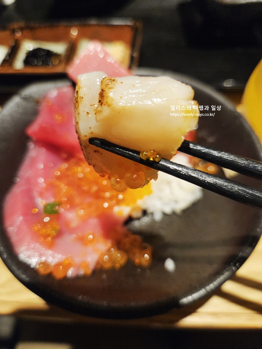여기에 연어, 연어알, 관자도 함께 올라가 같이 먹을 수 있어 참치의 진한 감칠맛과 기름진 풍미를 동시에 느낄 수 있다.