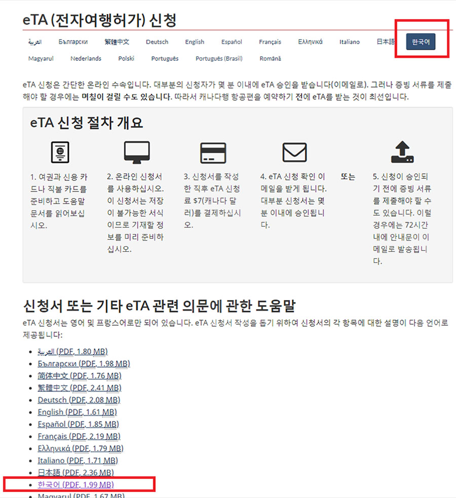 한국에서 접속하면 자동으로 한국어 체크가 되어있다. 처음 신청하거나 신청시 도움을 받으려면 스크롤다운 후 "한국어(PDF)"를 클릭해서 캐나다 eTA 신청하는 동안 참고할 수 있다.