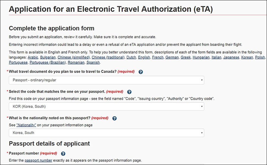 캐나다 eTA는 입력은 물론 모든 질문이 영문(프랑스)으로 질문이 작성되어있으므로 영어를 잘 모른다면 꼭 도움말 PDF 파일을 참고하여 작성하는 것이 좋다.