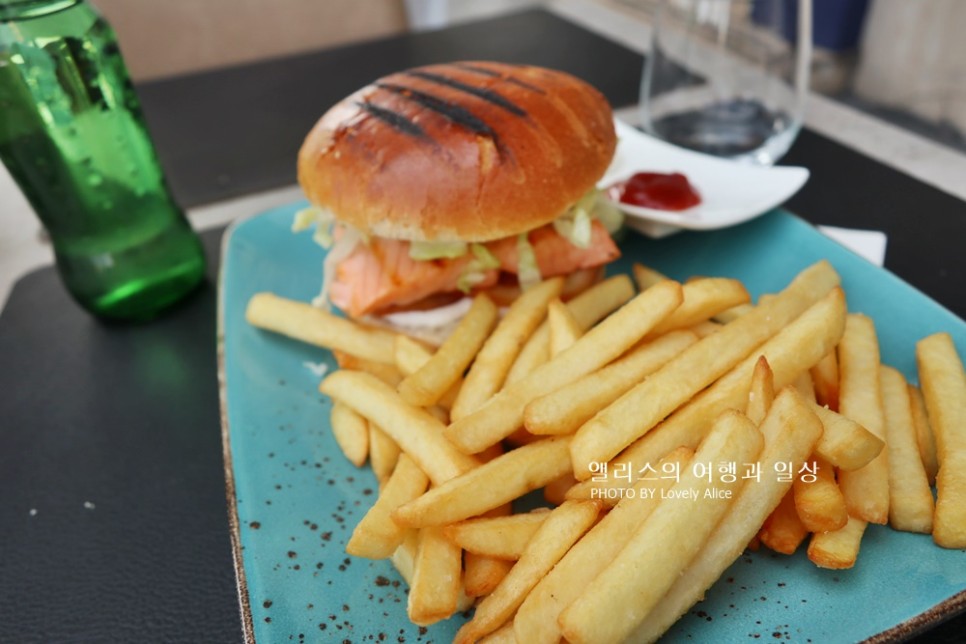 메뉴는 샐러드 먹을까 하다가 알래스타 연어 버거로 선택. 12유로