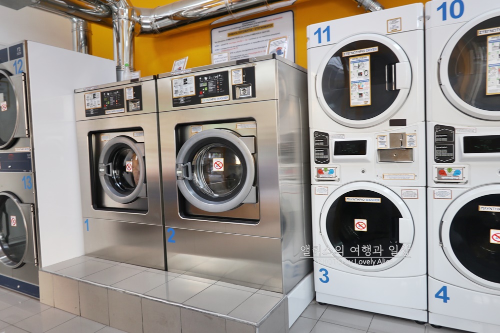 총 14개의 기계가 있었고 그 중 반은 세탁기계, 반은 건조기계다. 사람들이 몰리는 시간대는 언제인지는 모르겠지만 사람들이 딱히 몰린다는 생각은 들지 않았다. 용량에 따라 기계의 크기를 선택해서 이용하면 된다. 아래는 세탁기계, 위에는 건조기계.