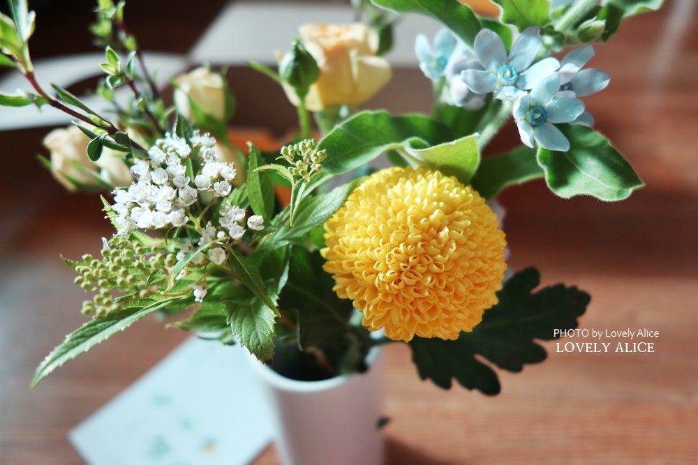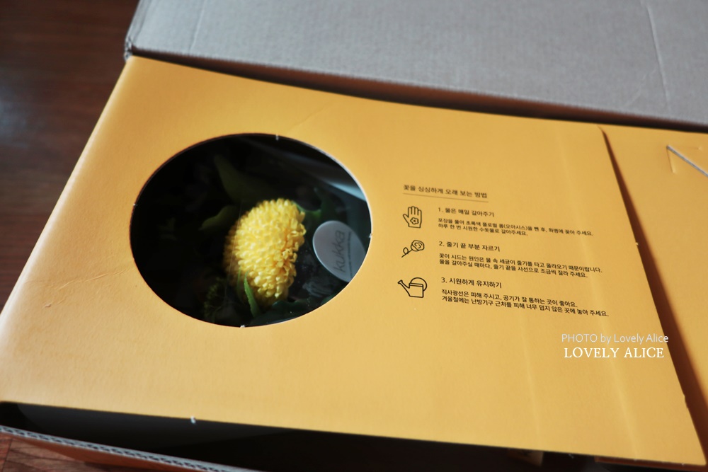 감사, 성실, 진실이라는 꽃말이 담긴 귀여움 퐁퐁이 먼저 눈에 들어온다. 둥글지만 꽃잎으로 가득찬 노란퐁퐁을 중심으로 노랗고 푸른 빛깔이 잘 어울린다.