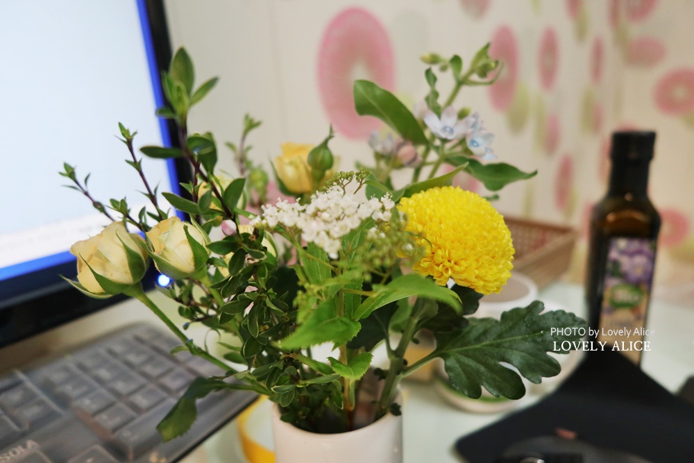 하얀도기에 꽃은 꽃은 깔끔하면서도 책상의 분위기를 해치지 않는다.