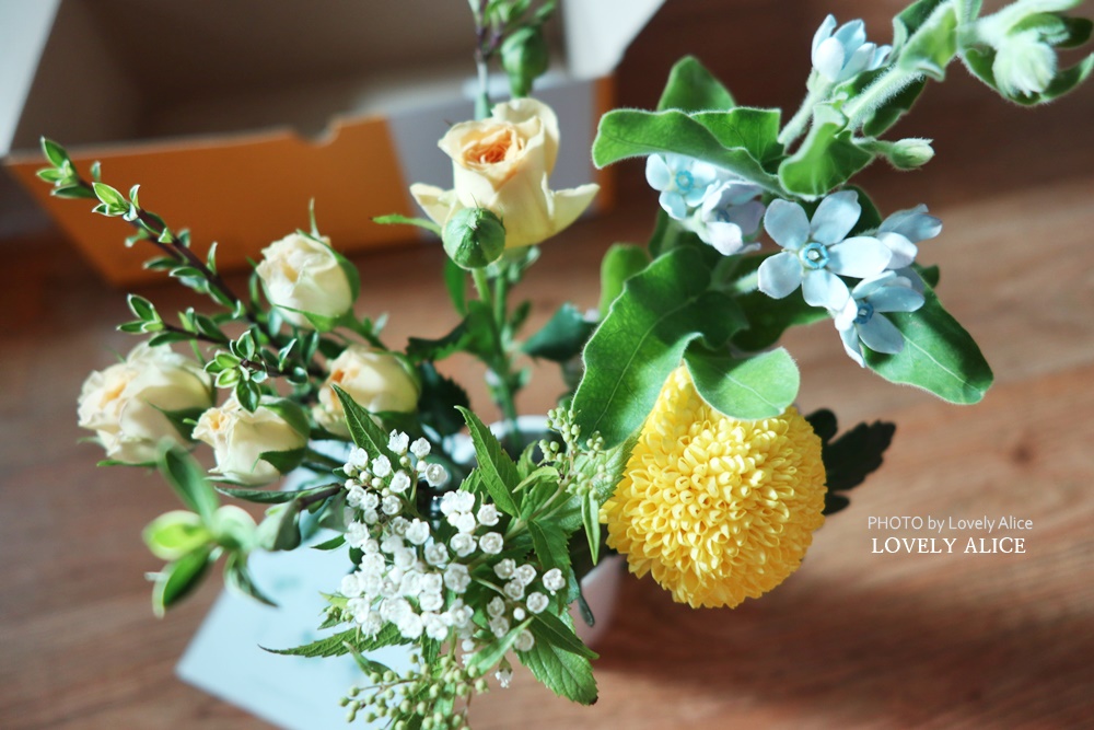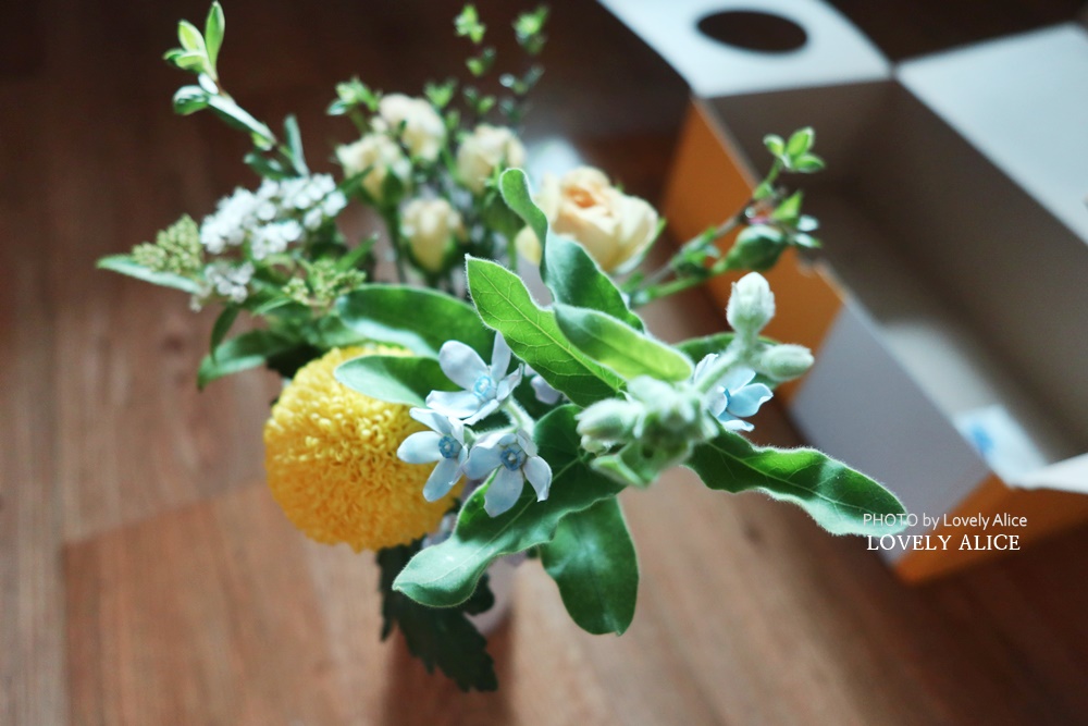 노랗기만 했다면 조금 심심했을지도 모른다. 하지만 여기에 블루옥시가 함께하니 전체적인 분위기가 더 상큼한 것 같다. 꾸까를 통해서 약 2년 가까이 정기구독 하면서 알게 된 여러 꽃중에 하나가 블루옥시다. 파스텔 톤의 하늘색 꽃잎이 예쁜 작은 꽃.