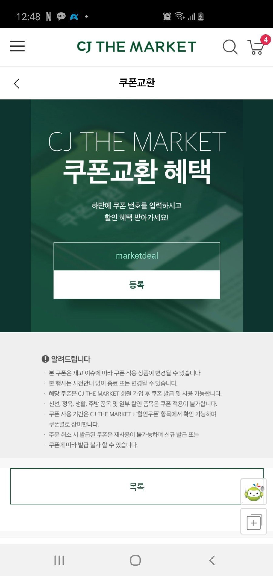 2. 쿠폰교환혜택 창에 "marketdeal"을 입력 후 등록버튼을 누른다. → 쿠폰 즉시 다운로드됨!
