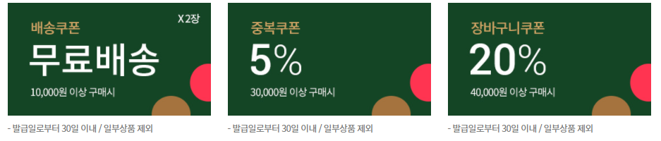 이건 달마다 약간씩 달라지는 부분이지만, 추가로 3만원 이상 구매시 45% 할인쿠폰 + 무료배송 쿠폰이 주어진다.