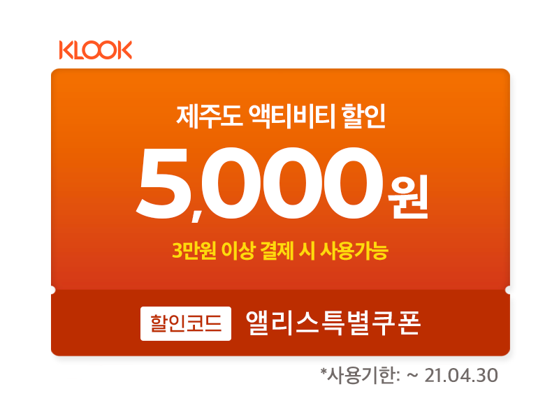 클룩에서 상품예약시 사용가능한 클룩 특별 할인쿠폰을 제 블로그와 공식제휴할 수 있는 기회가 생겼다. 클룩의 신규회원을 위한 전용 할인쿠폰이자, 나의 블로그에 포함된 특별링크를 클릭해야만 사용할 수 있는 쿠폰이니 필요한 분들이라면 알뜰하게 제주여행에 도움될 수 있는 쿠폰을 활용하자!