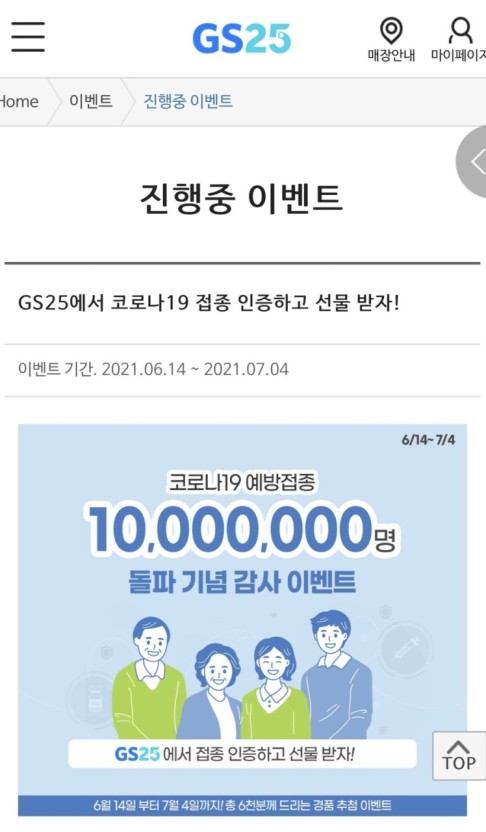 7월 4일까지 백신 접종자를 대상으로 경품 이벤트를 진행. GS25 사회관계망서비스(SNS)를 통해 전자예방접종증명서나 지류 증명서를 올리면 추첨해 ‘아이패드프로’ 5세대 등을 증정.