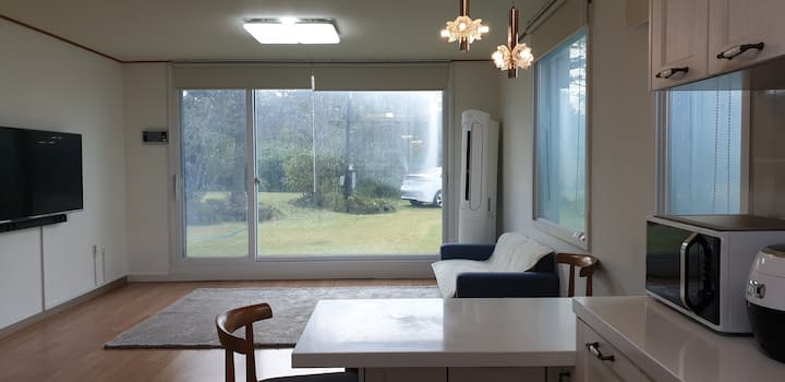 빌라 독채로 사용 가능하다. (1층, 2층 테라스 전부) 제주도의 중간 지점으로 제주시와 서귀포 서귀포시 어느쪽 관광이든 편리하게 이동가능하다는 장점, 숙소 주변에 오름이 많아 공기도 깨끗하다. 잘 알려진 박물관등도 10km 이내에 있어 여행이 편리하다.