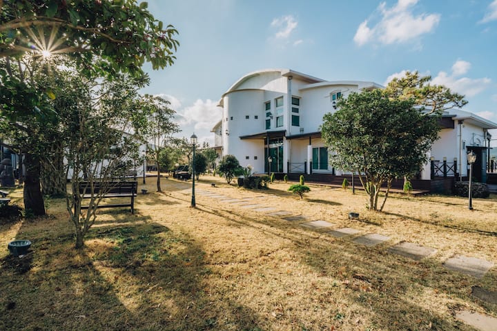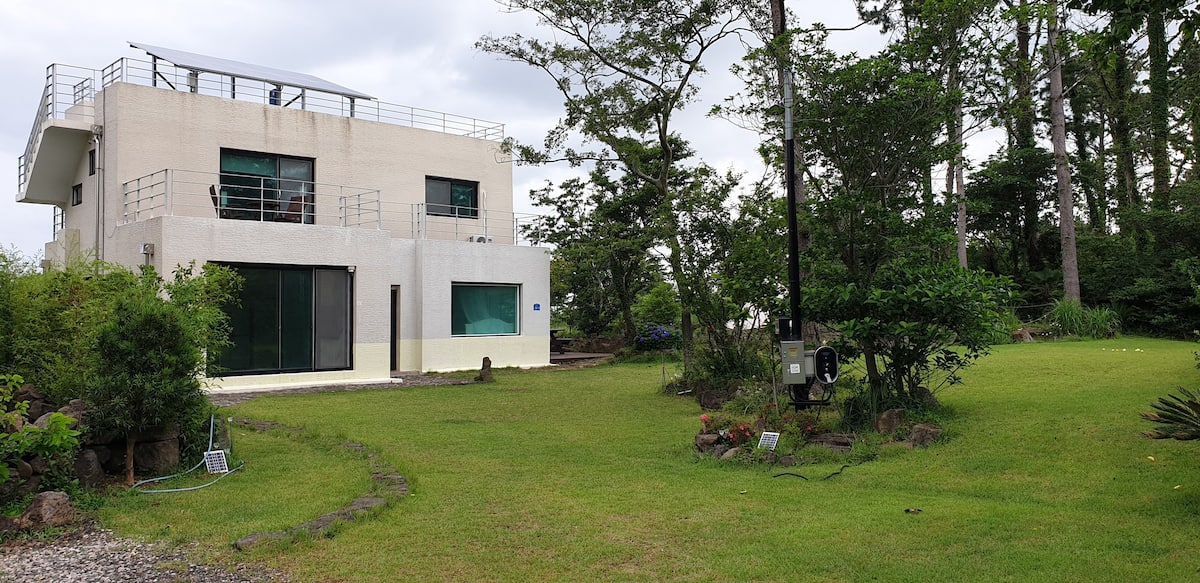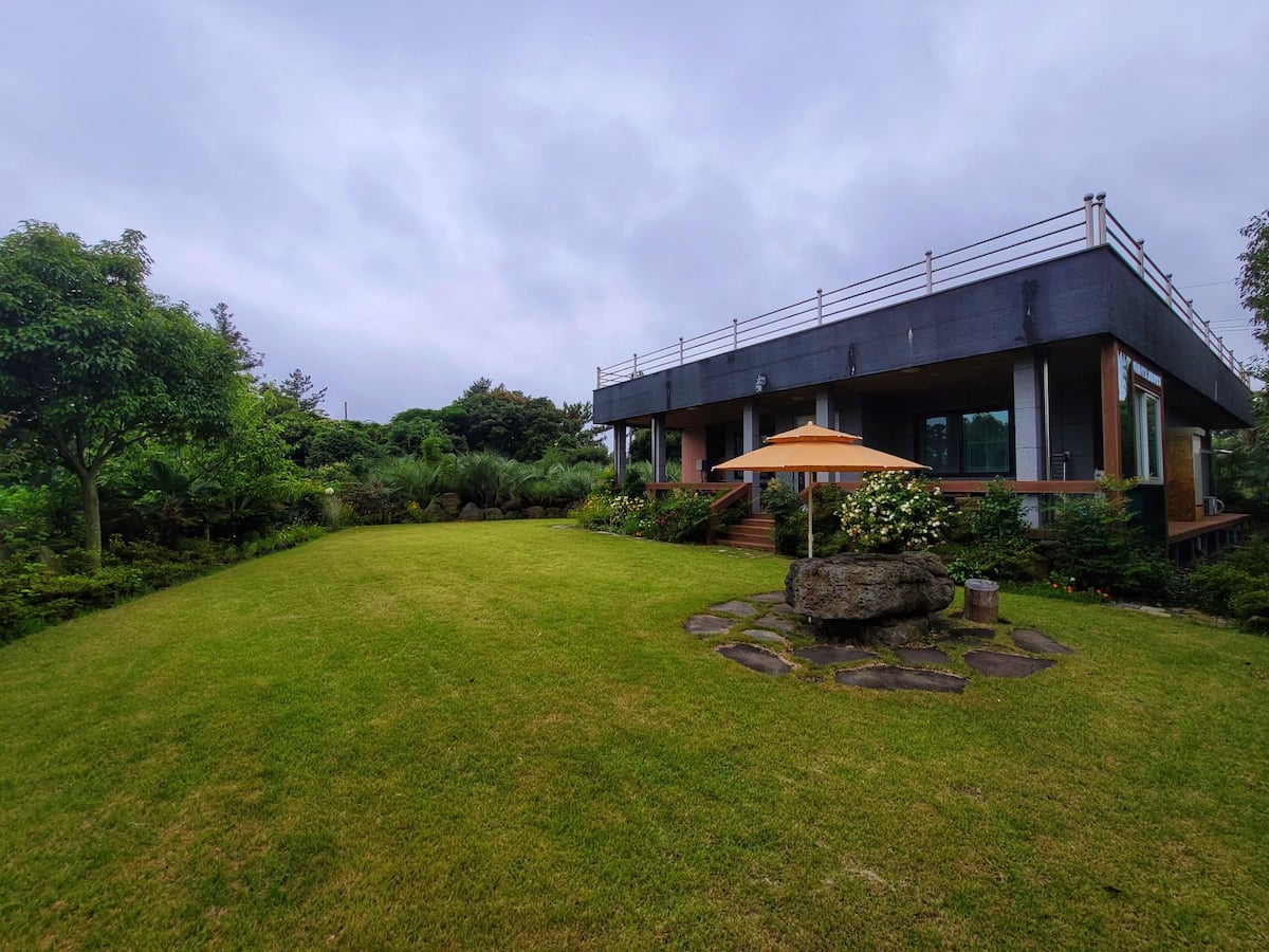 서귀포 혁신도시에 위치해 있으면 월드컵경기장이 보인다. 제주 전통 돌담으로 둘러쌓인 백년된 주택이다. 내부는 리모델링이 잘 되어있어서 지내기 편리하다. 300평의 정원이 넓게 펼쳐져있어 맘껏 뛰어 놀 수 있는 넓은 잔디마당과 제주의 사계절 야생화와 나무로 가득하다.