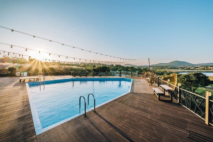 오름과 저수지에 둘러싸여 제주의 자연과 조용한 분위기에서 편안하게 쉬다 갈 수 있는 곳이다. 비록 원룸이지만 게스트용 별채를 단독으로 사용 가능하고, 너무 큰 공간이 아닌 성인 2인이 지내기에 적당한 공간을 원한 이라면 반려동물과 함께 지내기에 안성맞춤이다. 이용할 수 있는 수영장은 여름 시즌에 가능하며, 공용 공간으로 세탁실이 따로 있다.