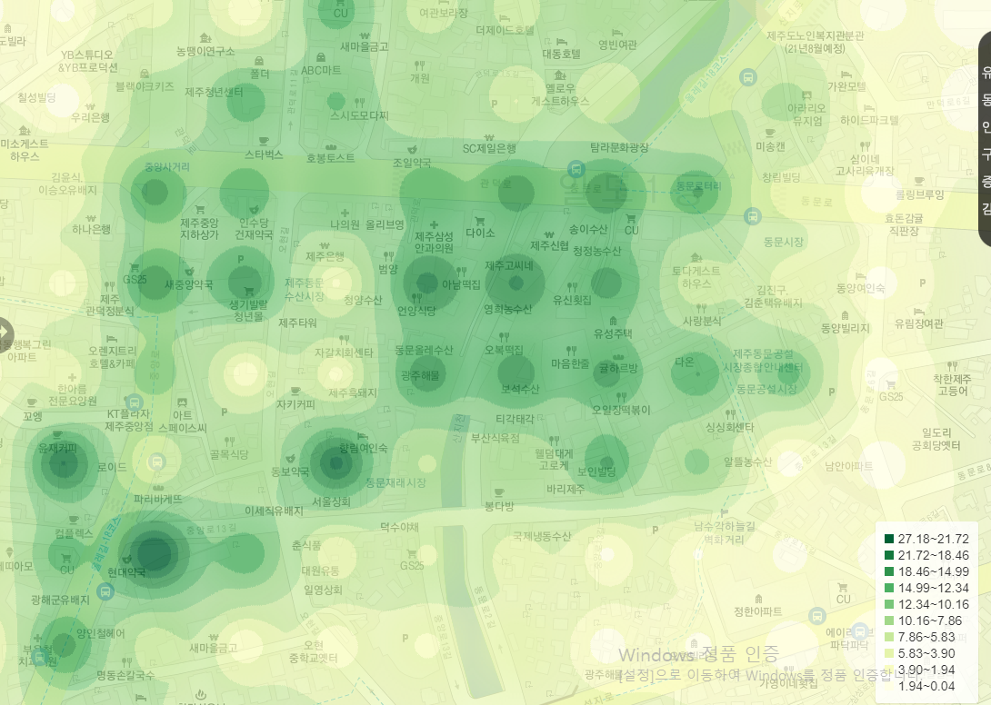지도를 확대할 수록 유동인구 증감과 유동인구가 밀집한 지역을 구체적으로 확인할 수 있고 그 수도 구체적으로 확인 가능하다. 간편하게 확대할 수 있기 때문에 원하는 지역을 볼 수 있고 명칭과 주소로 손쉽고 정확하게 확인 가능하다.