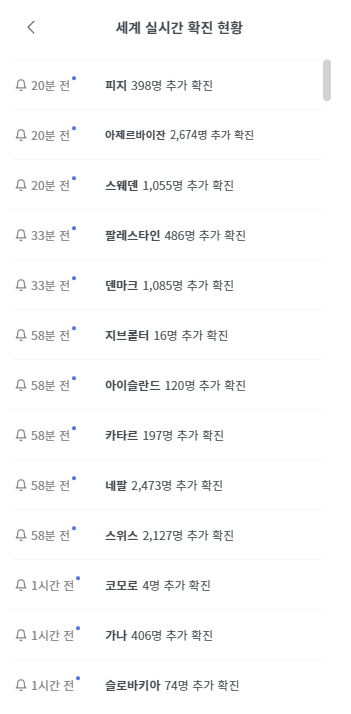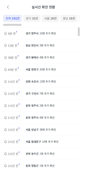 국가가 만든 웹사이트가 아님에도 불구하고, 이렇게 섬세하게 라이브로 관련 정보를 볼 수 있다는 사실에 먼저 감사한 마음이 들었다. 게다가 알람 형식의 이 안내는 실시간으로 어느지역 몇명이 신규확진자로 확진되었는지도 알려주고 있었으니, 이 웹사이트 하나면 실시간 구체적인 정보를 모두 볼 수 있었다.