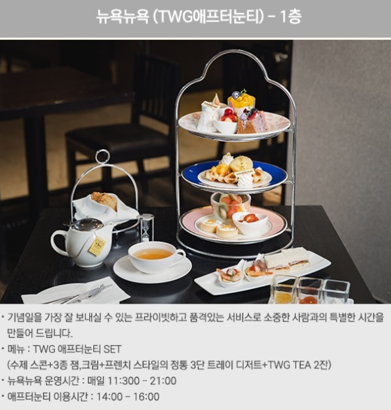 - TWG 애프터눈티 세트: 수제스콘, 3종 잼+크림, 프렌치 스타일의 정통 3단 트레이 디저트, TWG 티 2잔