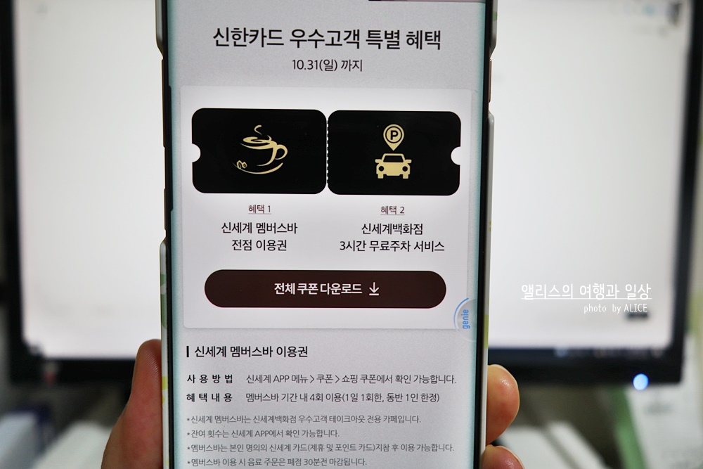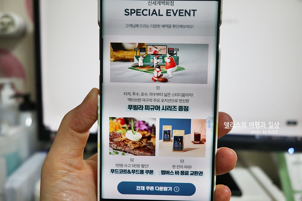 아래 쿠폰을 모두 다운받으려면 신세계백화점 어플을 미리 다운로드 후 회원가입이 되어있어야 한다.
