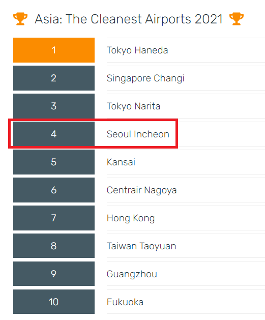 그럼 우리의 대표 공항, 인천공항은 2021 최고의 공항 4위에 선정된 것 외에 어떤 부분에서 두각을 나타냈을까? 청결도 우수 공항 5위, 아시아지역 공항 3위, 파트너 관계관리(PRM)과 장애인 편의시설 우수공항 7위, 공항보안부문1위, 코로나방역우수공항에 선정되었다. 대부분 상위권에 랭크된 것으로 인천공항이 국제공항으로도 충분히 좋은 성적을 거두고 있음을 알 수 있었다.
