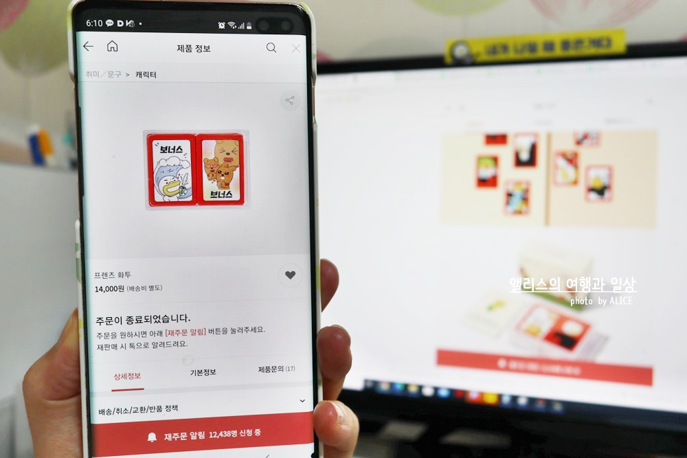 주문기간을 놓쳐서 주문을 못한 사람이라면 재준문 알림이라고 신청해보길 추천한다. 차후 순서가 돌아오거나 폭발적인 인기를 확인하고 프렌즈화투 생산량을 늘릴지도 모를 일이니까!