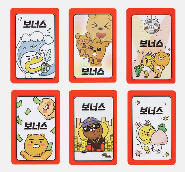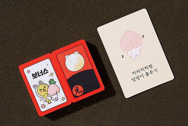아주 특이하게도 프렌즈 화투에는 보너스 카드가 있다. 총 6장으로 이 보너스 카드를 받게 되면 그 벌칙을 꼭 수행해야한다고. 그러니까 이 보너스 카드는 곧 벌칙카드다. 프렌즈 화투는 사행성을 지양하고 보다 재미있고 건전하게 화투를 즐길 수 있도록 장치를 하나 더 추가한 셈이다.