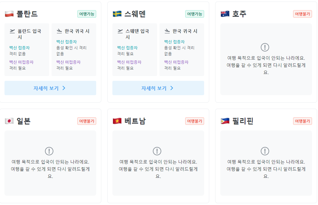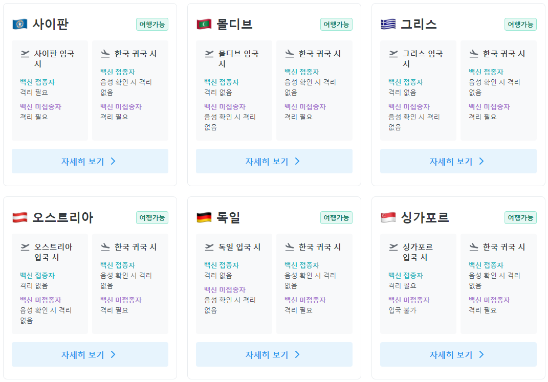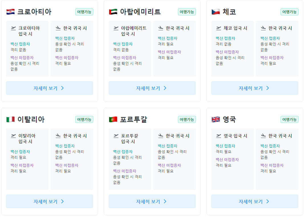 백신접종여부에 따라 자가격리 면제 또는 입국조건이 조금씩 달라지므로 입국 원하는 국가가 있을 경우 "자세히 보기"를 클릭하면 알 수 있다.