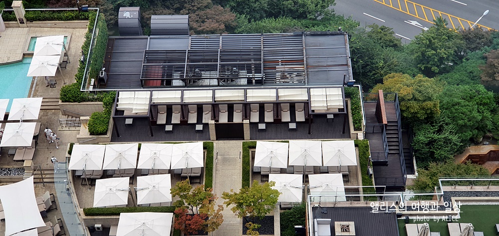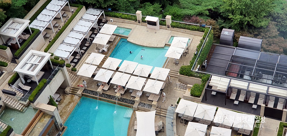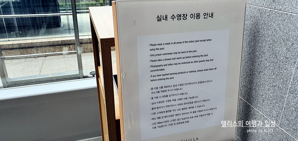 유리돔으로 되어있는 것이 특징인 서울 신라호텔 실내 수영장. 유리돔 너머의 남산 전경을 볼 수 있으면서 길죽한 풀장과 건식 사우나, 실내/야외 자쿠지가 있다. 별도의 락커룸도 이용할 수 있다는 장점도 크다.