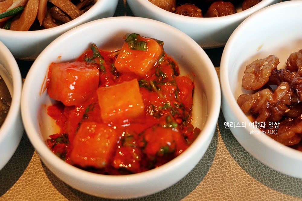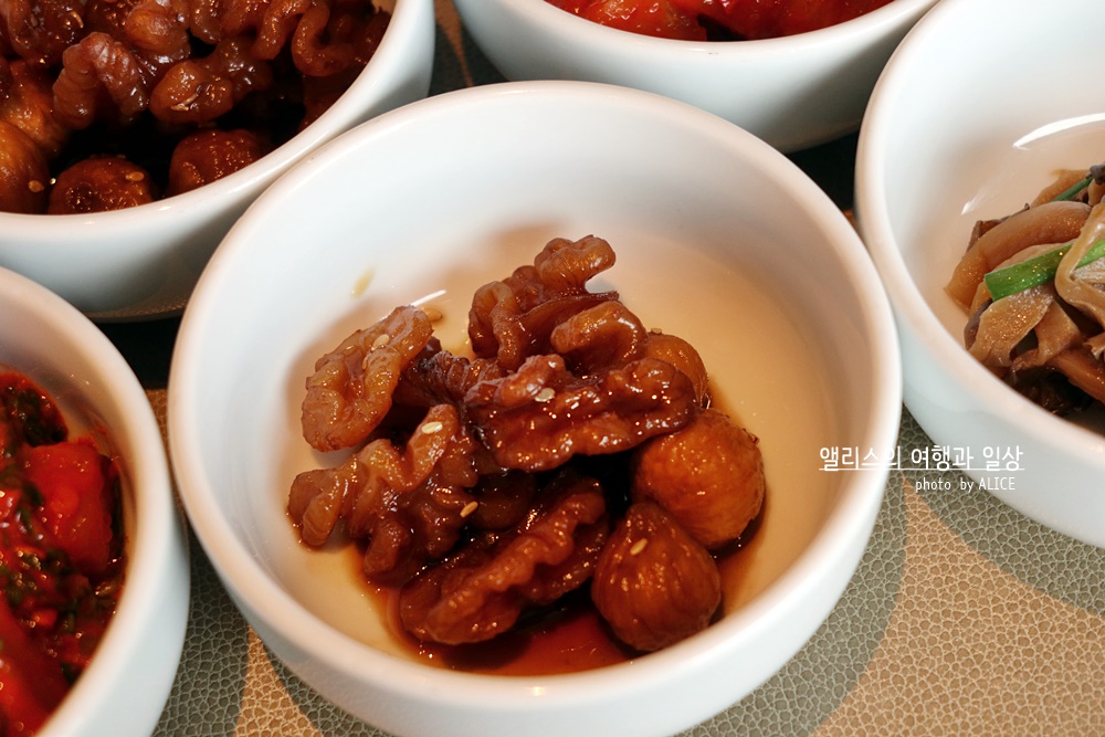밑반찬이야 매일 바뀌지만, 이날 반찬은 정말 베스트. 간장에 조린 새콤한 버섯, 가지나물, 호두/무화과 조림, 깍두기. 진짜 깍두기 최고였다. 사실 나는 김치를 좋아하지 않아 평소에 거의 먹질 않는데, 여긴 어떻게 만든건지 모르겠으나 깍두기 최고. 내 입맛을 단번에 사로잡았다!