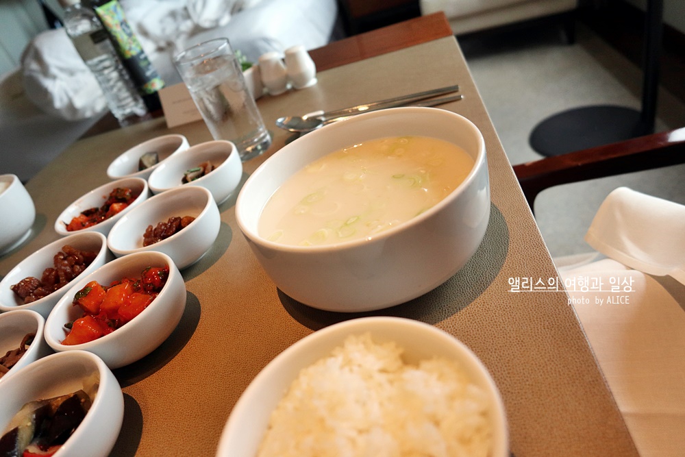 나의 경우 룸서비스 조식이 포함된 패키지로 예약했기에 쿠폰을 받았다. 전화로 룸서비스 조식 메뉴를 선택하고 매일 쿠폰을 한장씩 직원에게 주면 된다. 아침에 간단하게 먹기보다는 많이 움직여야 하는 내 일정상 든든히 한식 먹는 것을 선호해, 황태북엇국와 곰탕은 최고의 든든한 아침 메뉴가 되어주었다. 빵이 포함되는 아메리칸 스타일로 주문할 수 있으니 취향껏 선택하시길. 이렇게 2인 기준 9만원이었다.