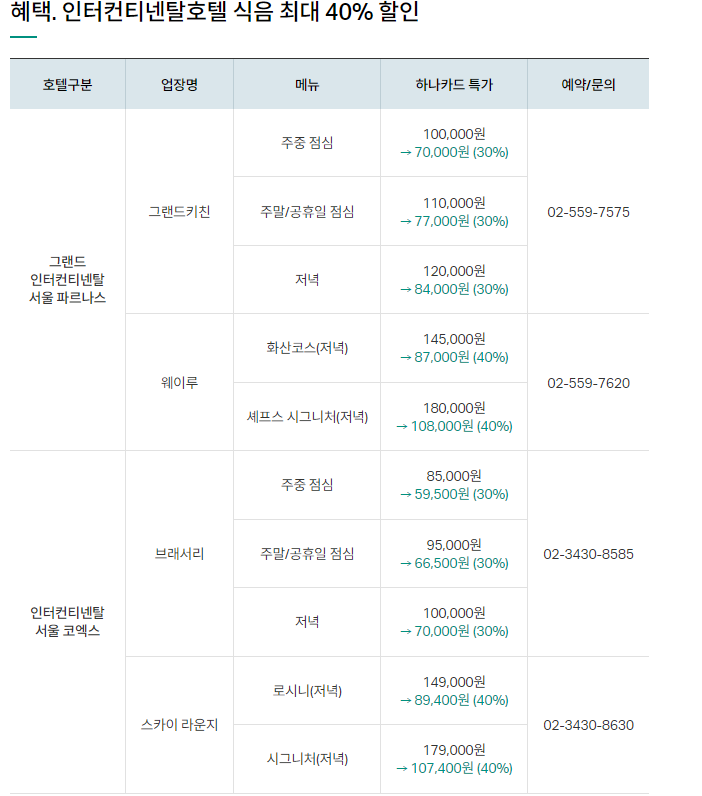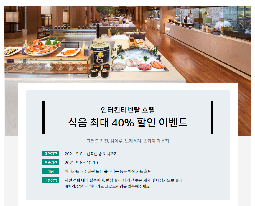 하나카드 인터컨티넨탈 호텔 식음(그랜드키친, 웨이루, 브래서리, 스카이라운지) 최대 40% 할인 (~10.10)