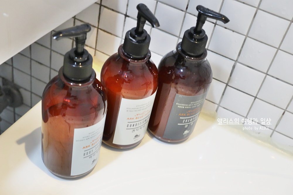 단점을 꼽으라면 샤워커튼이 따로 없기 때문에 샤워하는 동안 조심하는 것이 좋다. 욕조는 넓은 편에 속하기에 모든 일정을 마치고 잠만 자는 숙소로 아크블루를 선택하더라도 반신욕이 가능해서 피로를 푸는 데 좋을 것 같다.