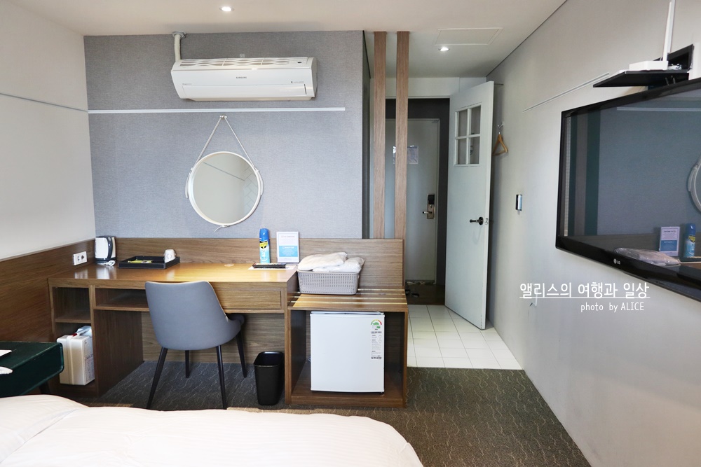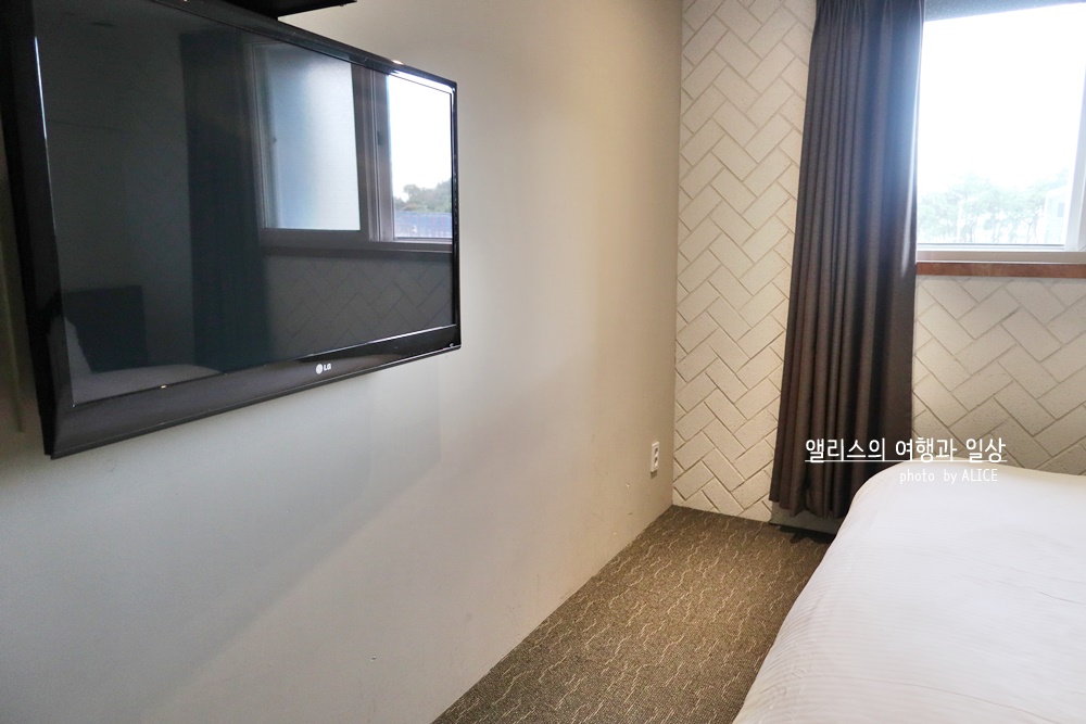 TV와 침대 사이에 여유로운 공간이 있고, 또 침대와 책상 사이에도 공간이 있는 편이라 여행짐을 풀기에도 적절하다. 물론 여행가방을 따로 둘 수 있는 공간이 냉장고 위에 있으니 객실이 아주 넓지 않은 만큼 나름의 공간을 좀 고려한 듯한 인상이 엿보였다.