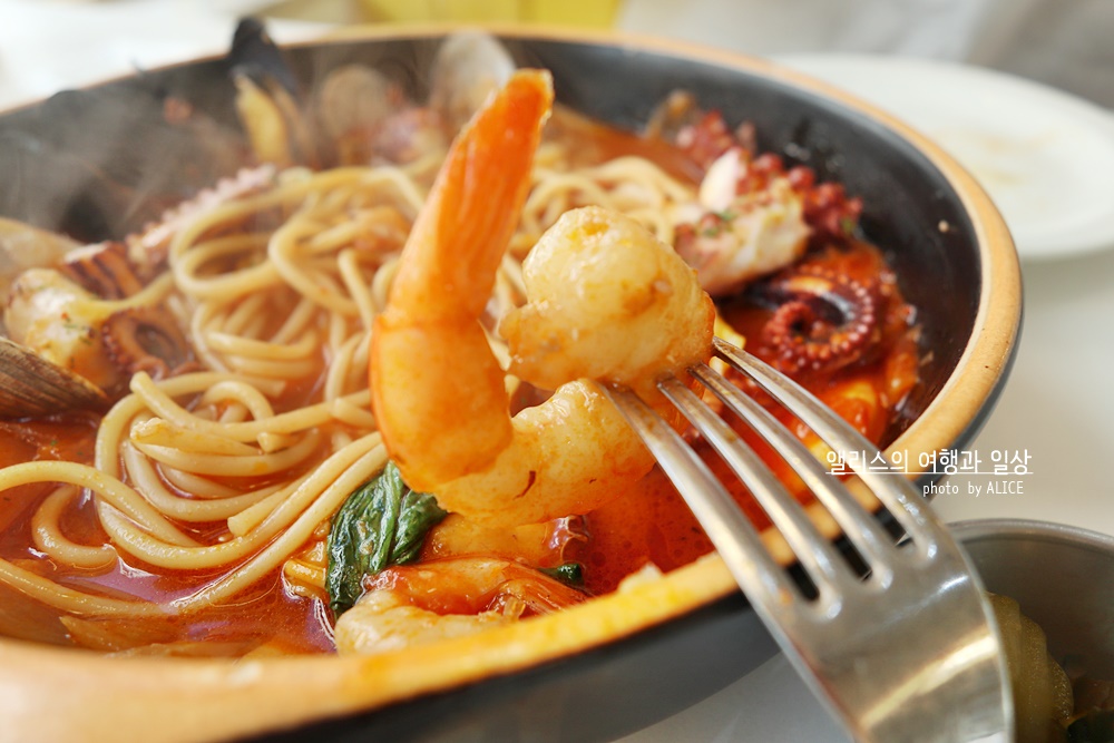 다른 해산물 역시 잘 익었고 맛도 좋았고 맛도 깔끔했다. 국물 한입 먹으면 느끼한 맛이 없어서 좋았다. 진짜 강추! 여수여행와서 누구에게나 익숙한 여수 음식 외에 이순신 광장에서 가까운 여수특색 음식을 찾는다면 행복파스타의 얼큰 돌문어 파스타 추천!