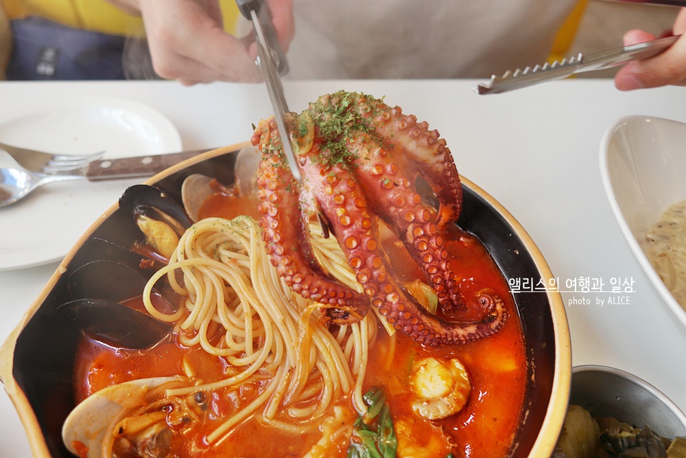 뚝배기 덕분에 열기가 오래가고 빠르게 식지 않는다. 여기에 해산물로 육수를 낸 덕분에 국물맛이 아주 좋고 적당히 얼큰한 맛에 완벽한 한국입 입맛 취향 저격. 진짜 밥이 있다면 밥말아먹고 싶었을 정도다. 두꺼운 여수 돌문어는 먹기 좋은 크기로 잘라내고 잘 익은 파스타 면에 돌돌 말아 돌문어를 얹어먹으면 엄직 척! 내 스타일의 파스타가 맞았다!