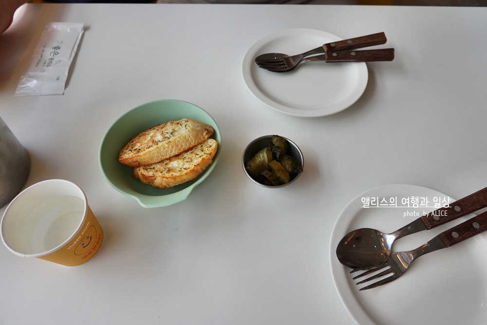 식전빵은 마늘빵이었다. 보통 마늘빵하면 겉과 속이 바삭한 경우가 많은데(나는 이게 싫음) 행복 파스타의 식전빵은 겉만 바삭할 뿐 속은 촉촉하고 쫄깃했다. 맛이 좋음!