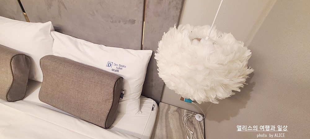 보통 베개 위에 쿠션이 있는데 별도의 경추베개가 있다. 이 서비스도 무척 마음에 들었다. 별도로 요청한 것도 아닌데 이렇게 경추베개가 있으니 푹신한 베개를 좋아하면 하얀 베개를, 적당히 받쳐주는 경추베개를 원하면 뒷목 굴곡에 맞춰서 경추베개를 이용하면 된다. 매우 만족스러운 서비스!