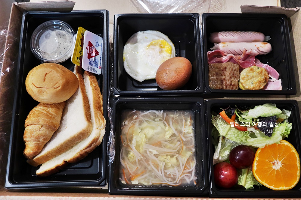 도시락을 챙겨 객실로 가져와보니 생각보다 크기가 컸다. 결코 크기가 작지 않았다. 그리고 같이 제공되는 <향긋한 향기의 아메리카노까지 아주 완벽>했다. 내 기대보다 든든하고 괜찮아서 인상적이었다. 먹기 좋고 영양성분을 고려해서 나뉜 칸막이에 채워진 도시락. <계란도 두 가지 타입>으로 들어있어서 선택으로 먹을 수 있으니 이것도 편리했다. 빵은 식어도 촉촉함을 가지고 있는 빵이었고 아침에 속을 풀어주는 부드러운 게살수프도 마음에 들었다.