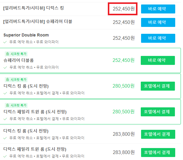 · 현재 호텔 가격비교 서비스 기준 최저가 (시티뷰) 252,450원 / (오션뷰) 308,550원